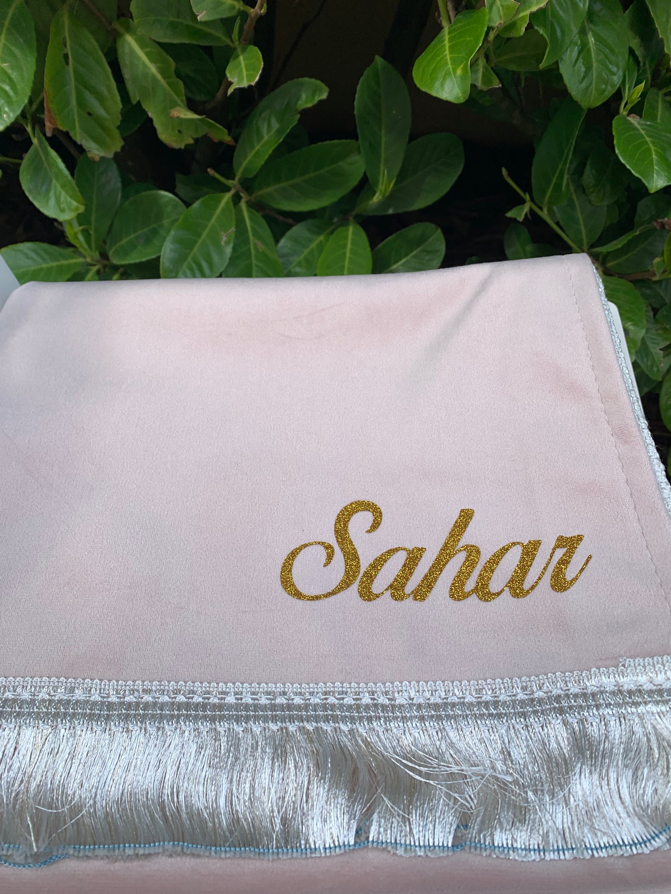 Tapis de prière rose clair, élégant et délicat.