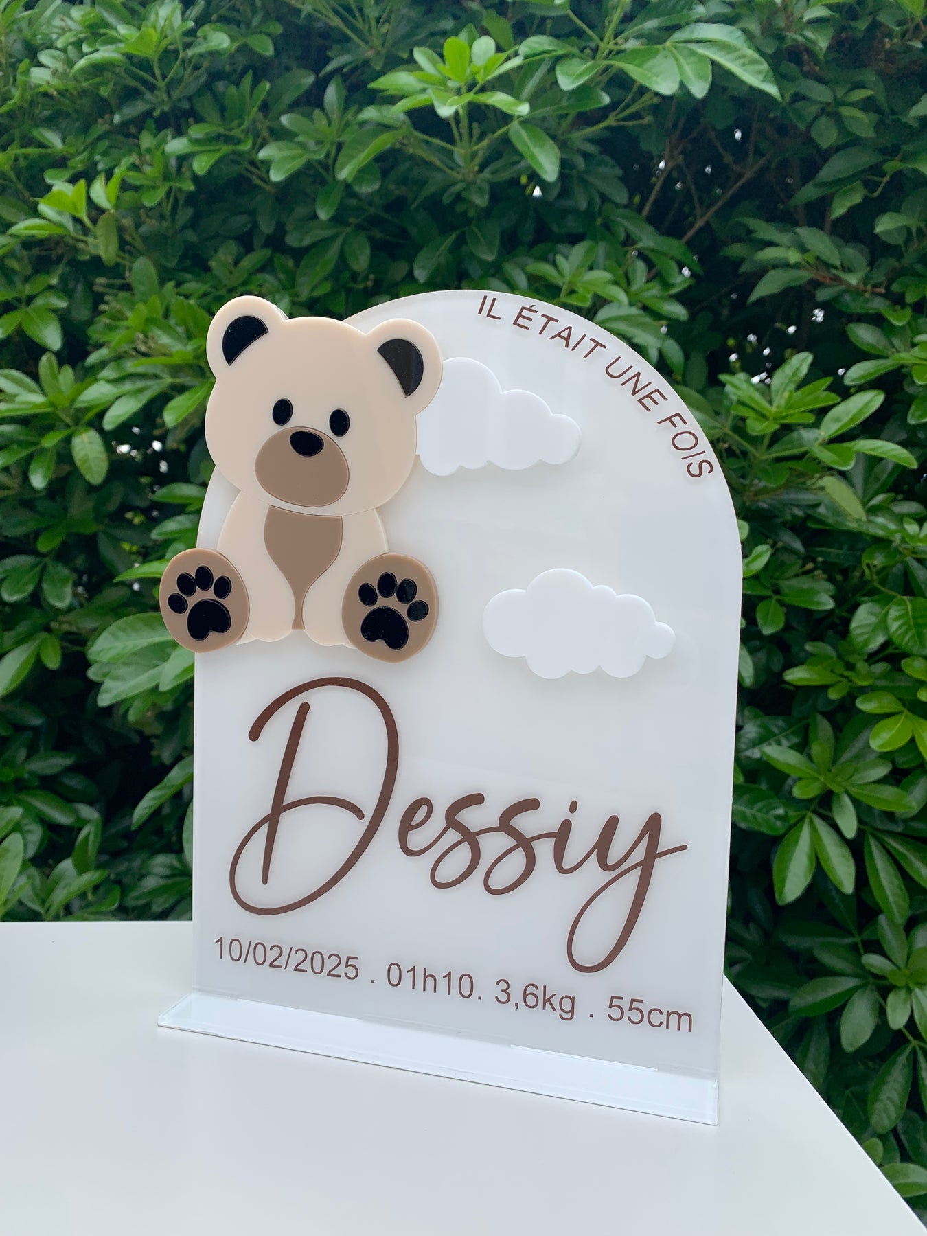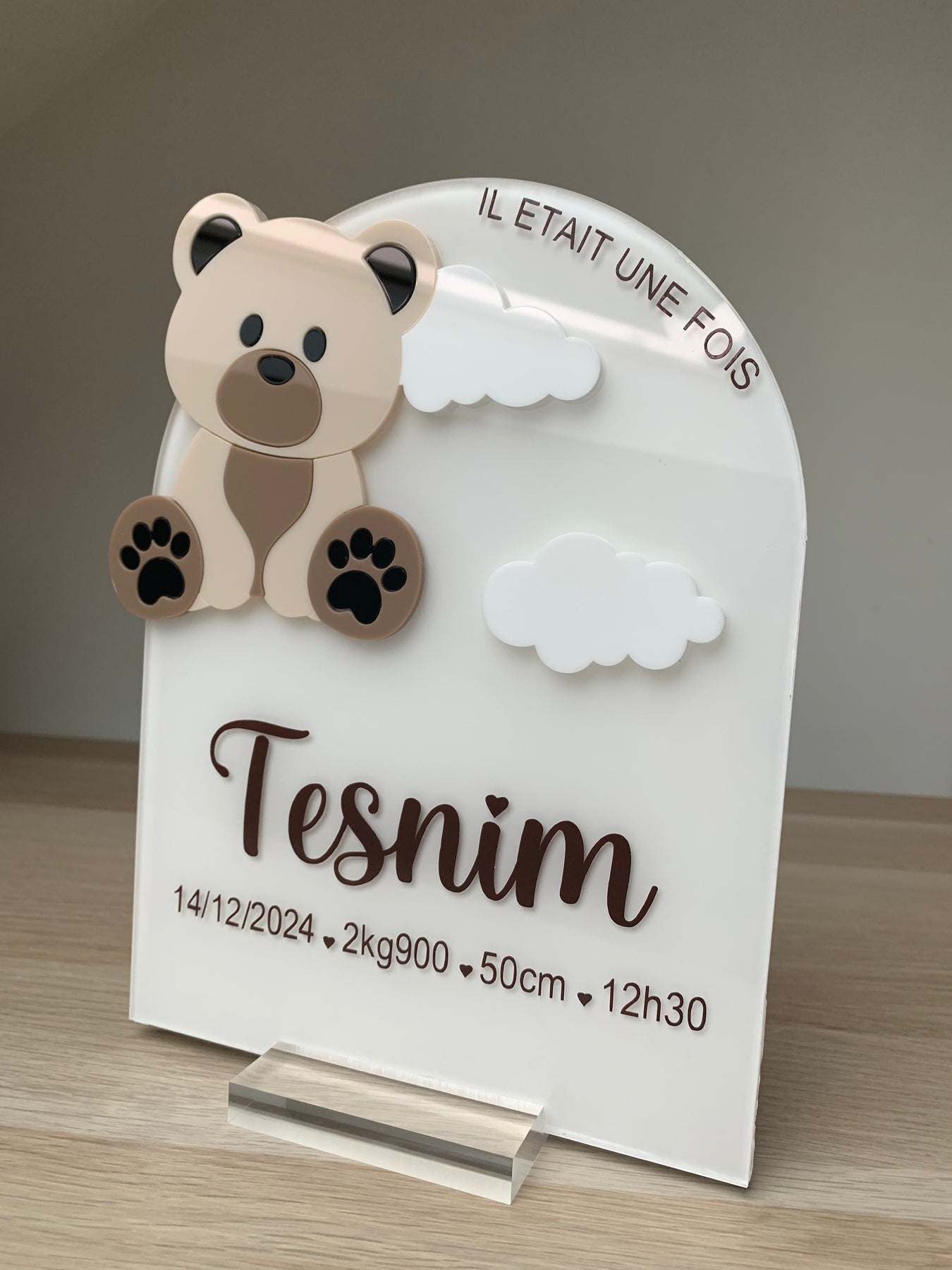 Adorable plaque de naissance en forme d'arche avec ourson en relief, parfaite pour décorer la chambre de bébé, avec douceur et élégance.